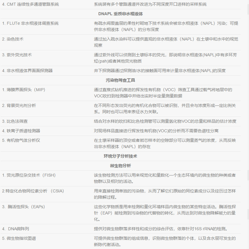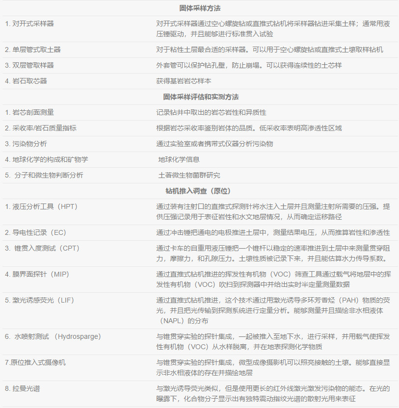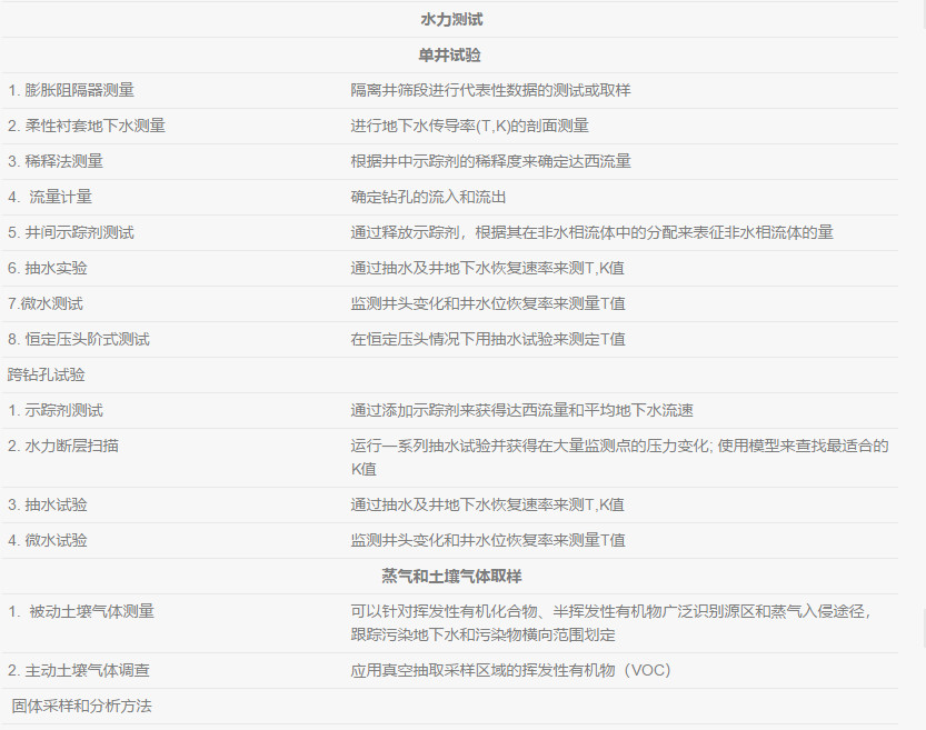 在不同種類的土層中, 都存在影響著DNAPL、溶解態(tài)還有氣態(tài)污染物行為的物理特性。地質(zhì)參數(shù)可以幫助了解土層中影響所有相態(tài)污染物(NAPL,溶解態(tài),吸附態(tài)和氣態(tài))遷移的宏觀和微觀特征。每一個地質(zhì)參數(shù)都在一定程度控制著土壤地下水的水文特征。通過分析比較土層中的物理特征與測量到的土壤地下水中流動相的水文特征,可以了解污染物的遷移和分布,并完善并驗證場地概念模型。地質(zhì)、水文和化學(xué)特性應(yīng)該要同時評估并進行分析。